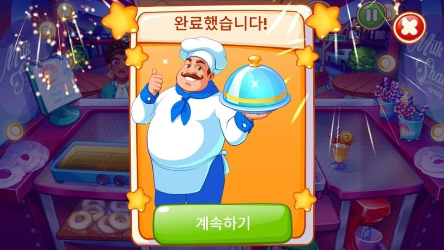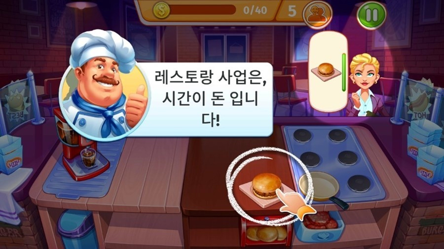 손님이 주문한 메뉴를 제시간에 제공해야 돈을 벌 수 있으며 스테이지를 완료하면 보상을 얻게 됩니다.