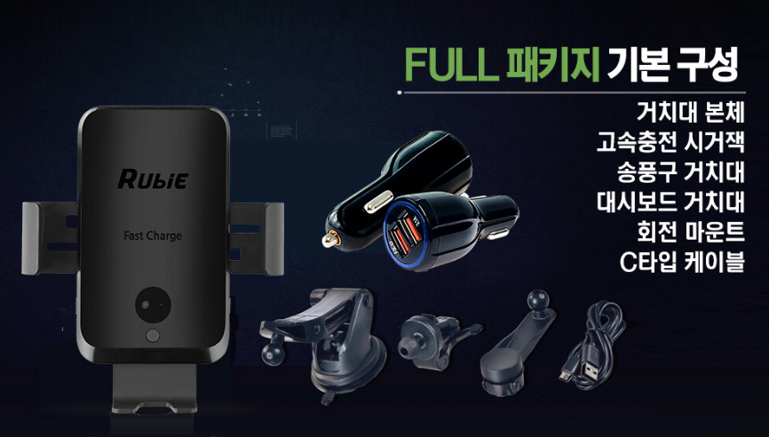 루비 스마트 무선충전기 구성품을 살펴보면, 거치대 본체와 고속 충전 시거잭, 송풍구 거치대,