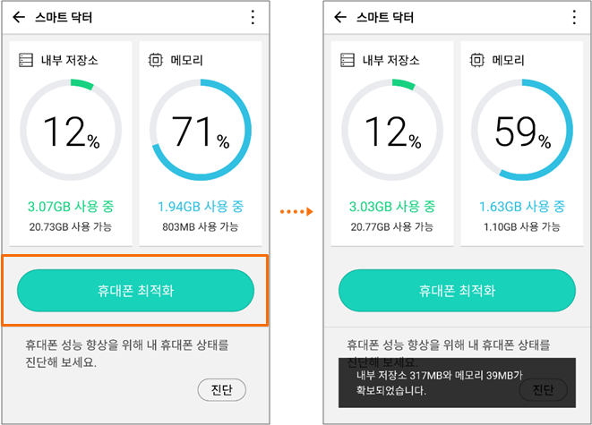 그리고 휴대폰 최적화를 눌러주시면 핸드폰 내부에 저장되어있던 메모리들을 정리해 줍니다.